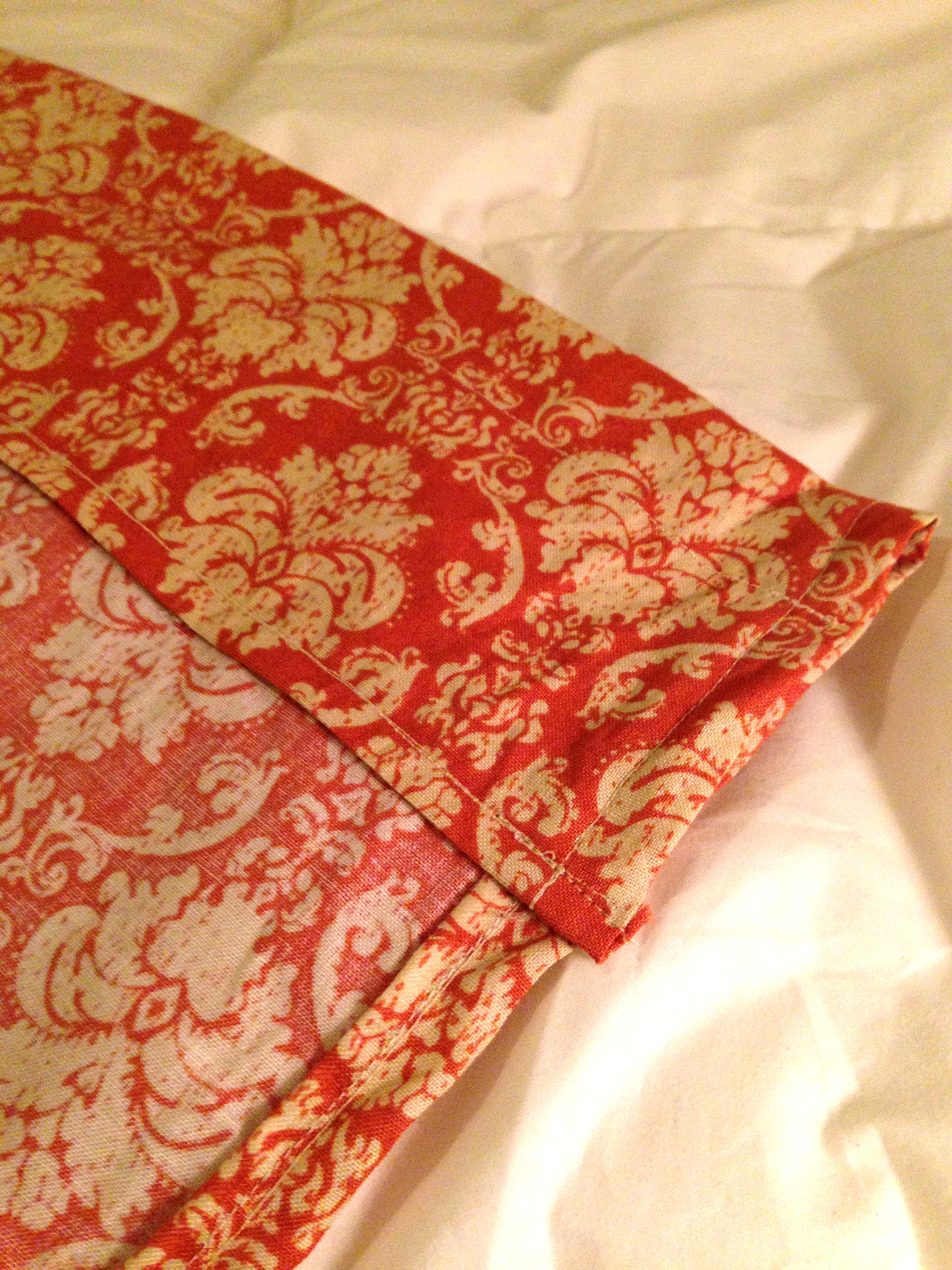 9. At this point, hang your curtains and check out the length. Mark 1/2″ from the bottom of where you want your curtains to hang with pins and take the curtains down. Cut the curtains along the pinned line and then fold and pin up the bottom of the curtains 1/4″. Sew the bottom seam of the curtains about 1/4″ from the fold. Fold and pin the bottom of the curtains up 1/4″ again to finish the bottom of the curtains. Sew at 1/4″ from the fold.