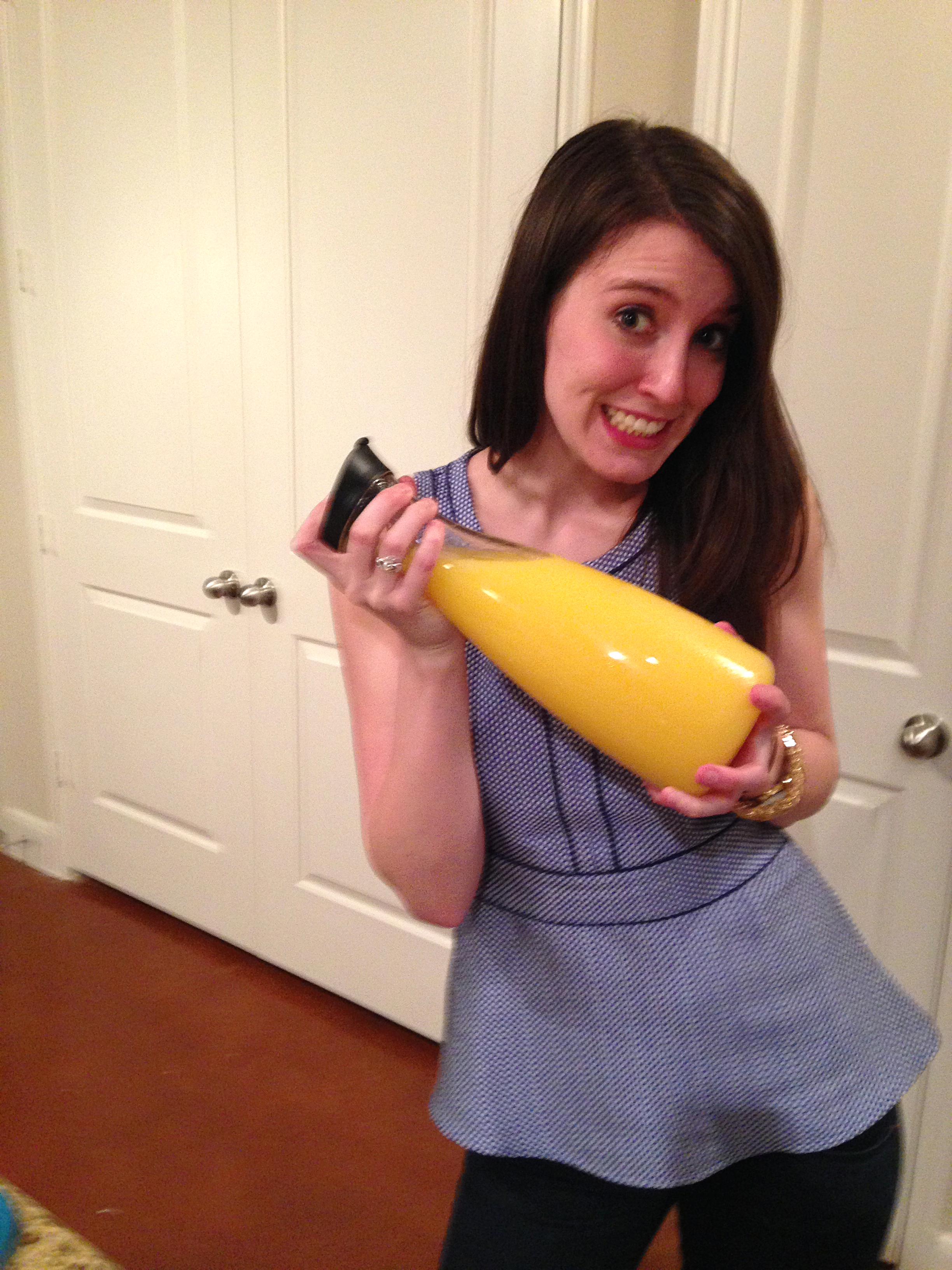 With such a travesty upon us, we got crafty and hit the liquor store for supplies. We ended up going with a bit of regular orange juice as well because it’s easier to find in stores and allows for a whole lot less juicing, and all the more time for playing!