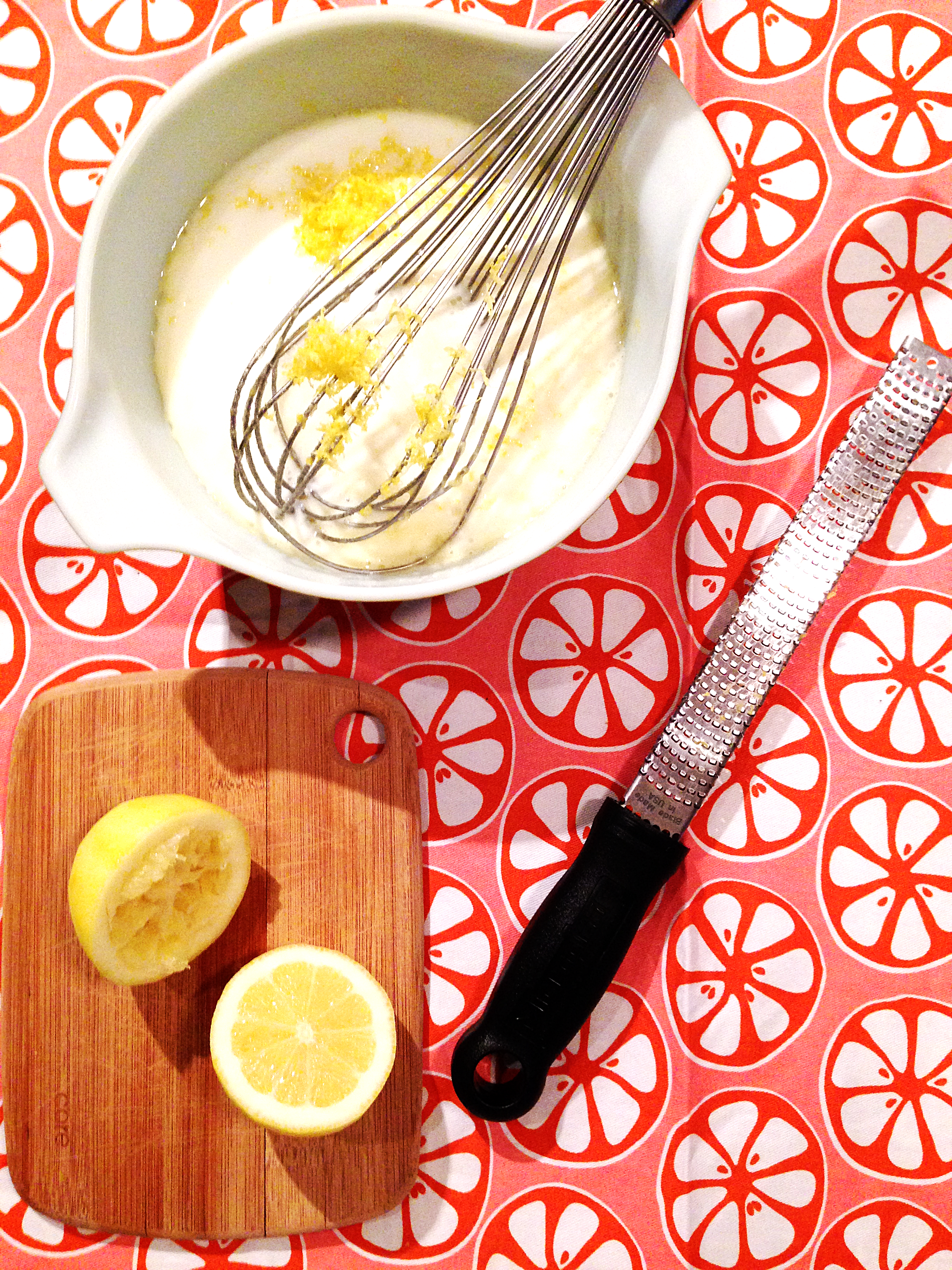 3. Zest the lemon. Add the lemon juice, buttermilk, and lemon zest to the wet ingredients bowl. Use a semi-fine grater or a zester (all I had in my case) to grate up the zucchini. Fold this into the batter (aka don’t blend it in, just stir it so the zucchini doesn’t get turned into a puree).