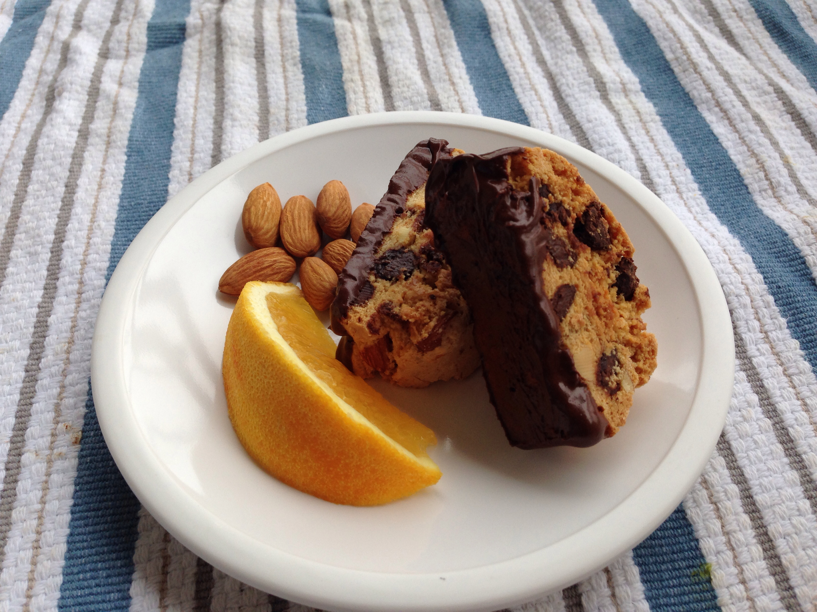 4. Remove the tray from the oven and let the biscotti cool completely. Heat up your dark chocolate chips (3/4 cup) in the microwave at 30 second intervals, stirring between each cook time, until all of the chocolate has melted. Dip the bottom of each biscotti into the chocolate and let cool back on the tray.