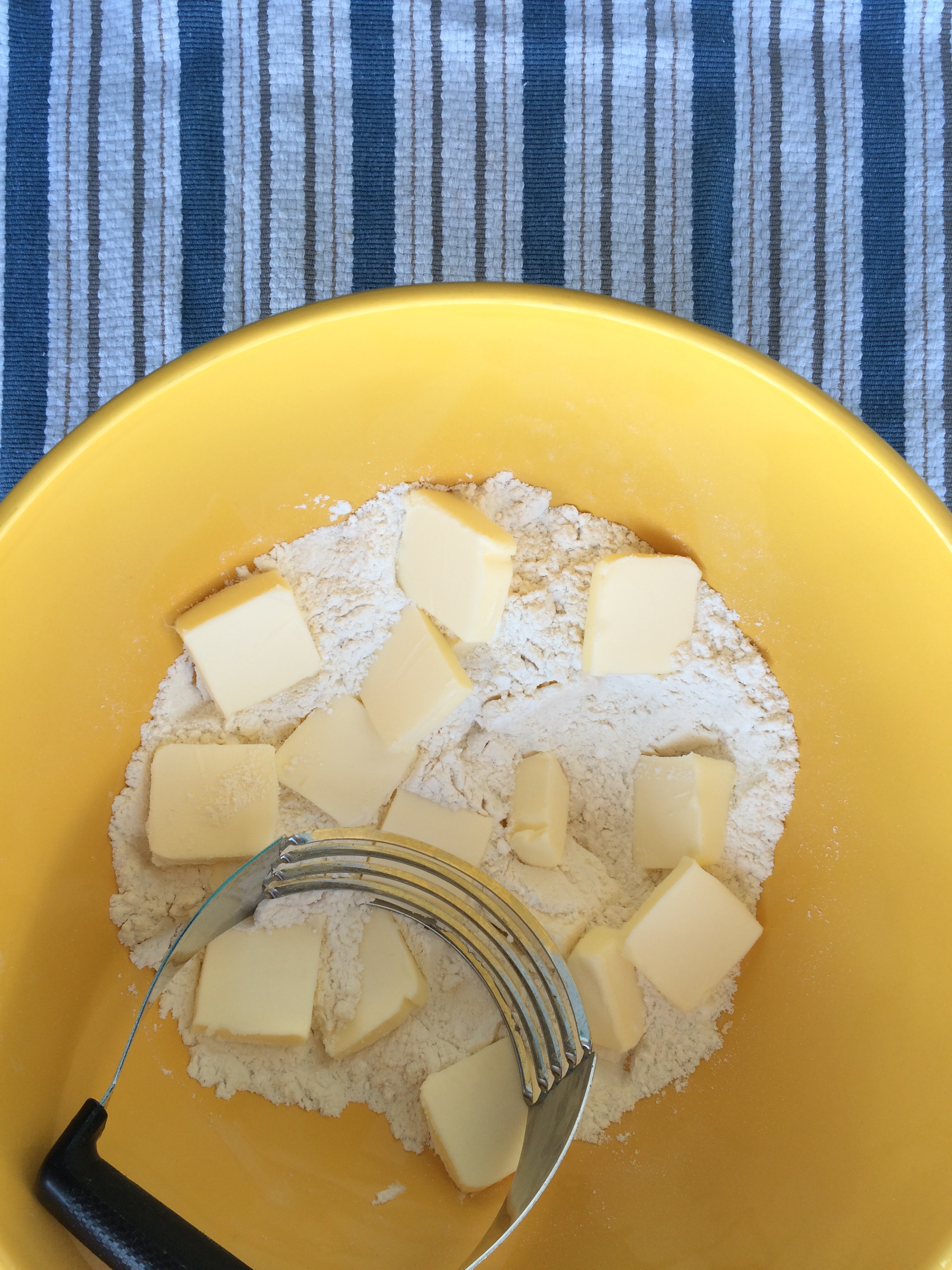 1. Preheat the oven to 325 deg F. Mix together the powdered sugar, 1 1/2 cups of flour, and salt in a bowl. Cut up the butter into small pieces and put them into the bowl with the dry ingredients. Use a pastry blender, or your hands, to break up the butter into even small pieces while incorporating it fully into the dry ingredients. This will make a crumbly mixture that sticks together slightly when pressed down.