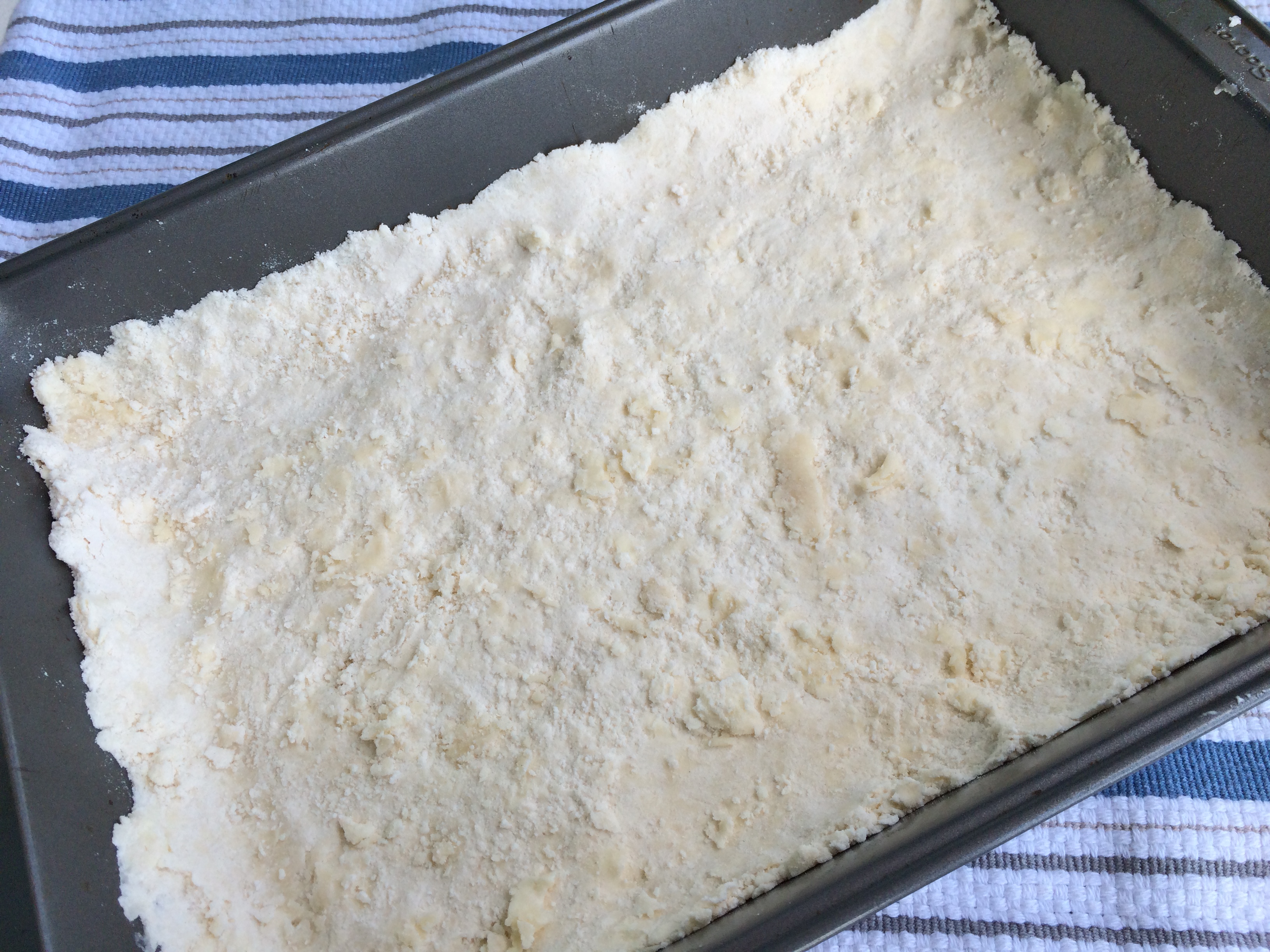 Take this mixture and pour it into a 13″ x 9″ pan. Use your fingers to press it down into the bottom of the pan and up the sides about a 1/2″. Place the pan in the oven and bake for 20 minutes.