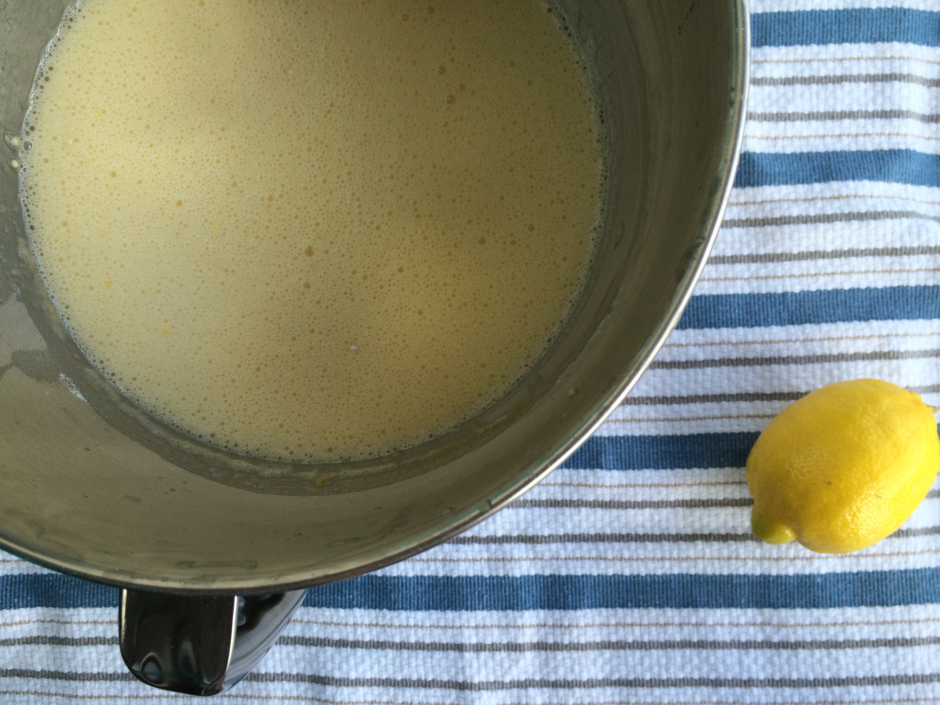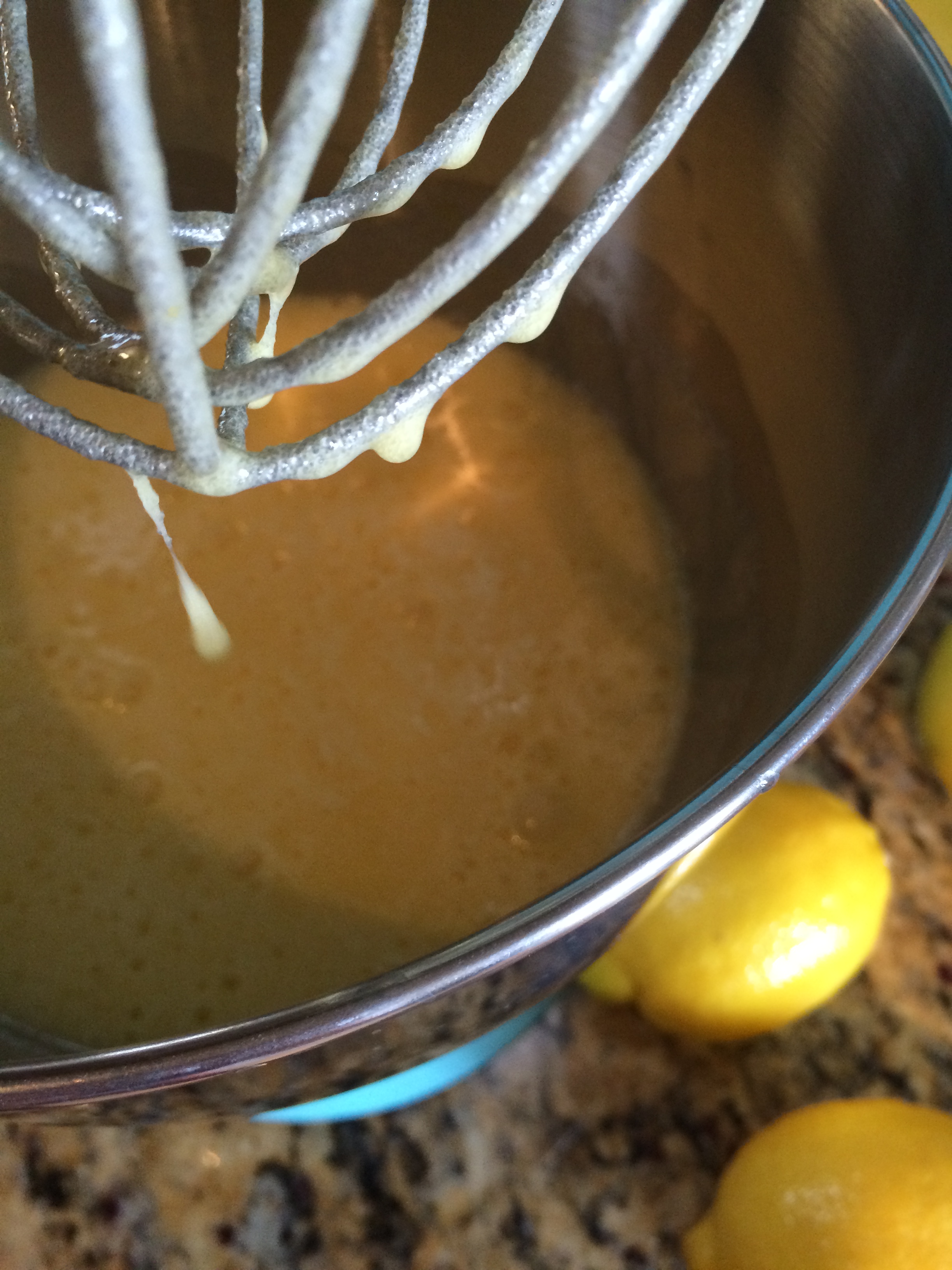 2. In a new bowl, mix together the eggs and the sugar until fully combined. Add in the lemon zest. Juice up the zested lemon and about 5 others to get the 1 cup + 2 Tbs. of lemon juice and add this into the bowl. Make sure not to get any seeds in the mixture. (NOTE: You may also use lemon juice from a bottle.) Mix this all up. Lastly, slowly add the 1/2 cup of flour to the mixture to thicken it slightly.