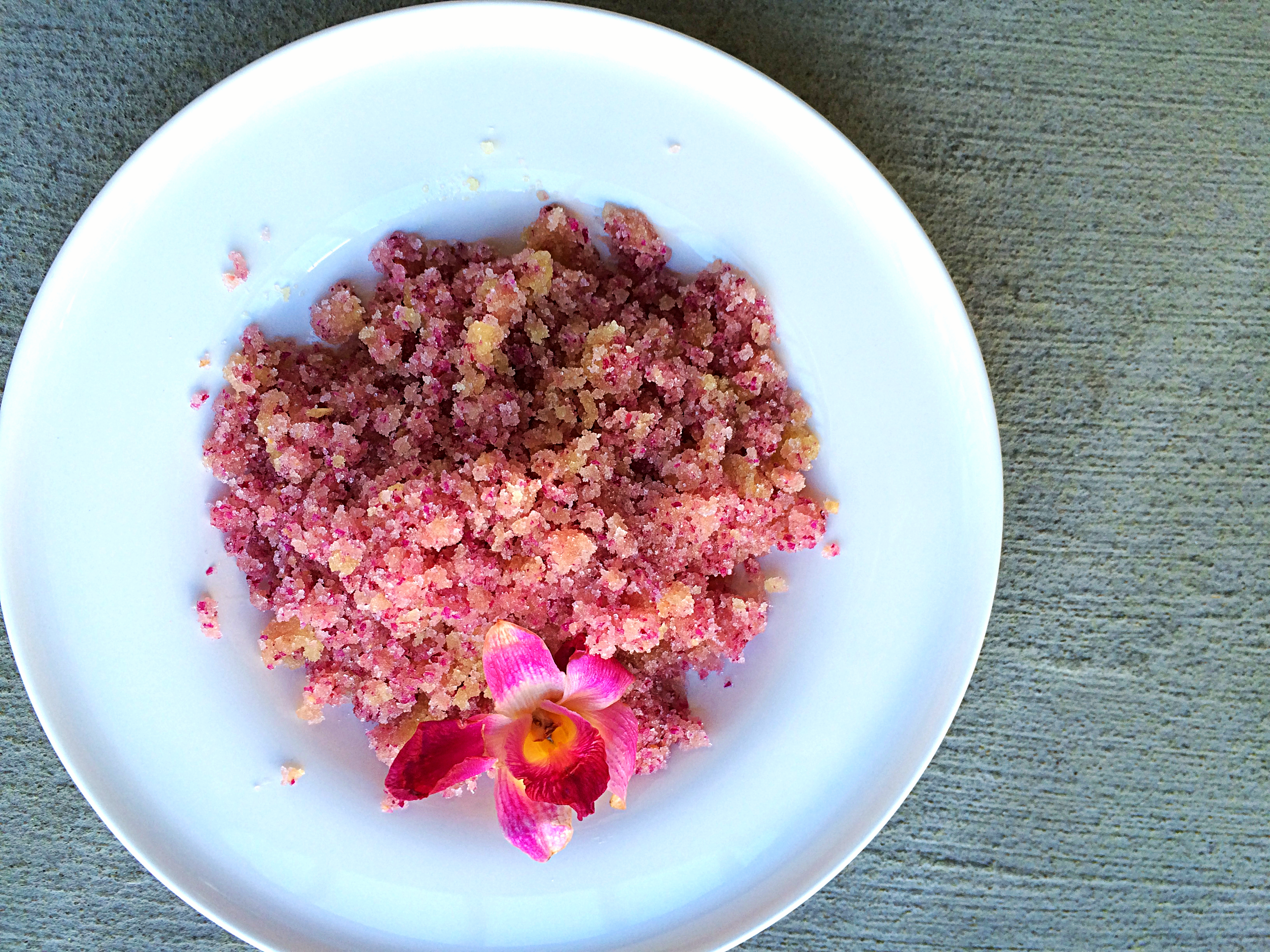 If you’re reusing a lei like I did, start plucking the fresh petals off of it until you have a large handful. Pour the sugar, oil, and petals into the food processor. Pulse until the petals have all broken down and dispersed themselves into the sugar. Take the scrub out and store in a jar with a lid. During your next shower, scrub your arms, legs, and body for a smooth, exfoliated feeling!