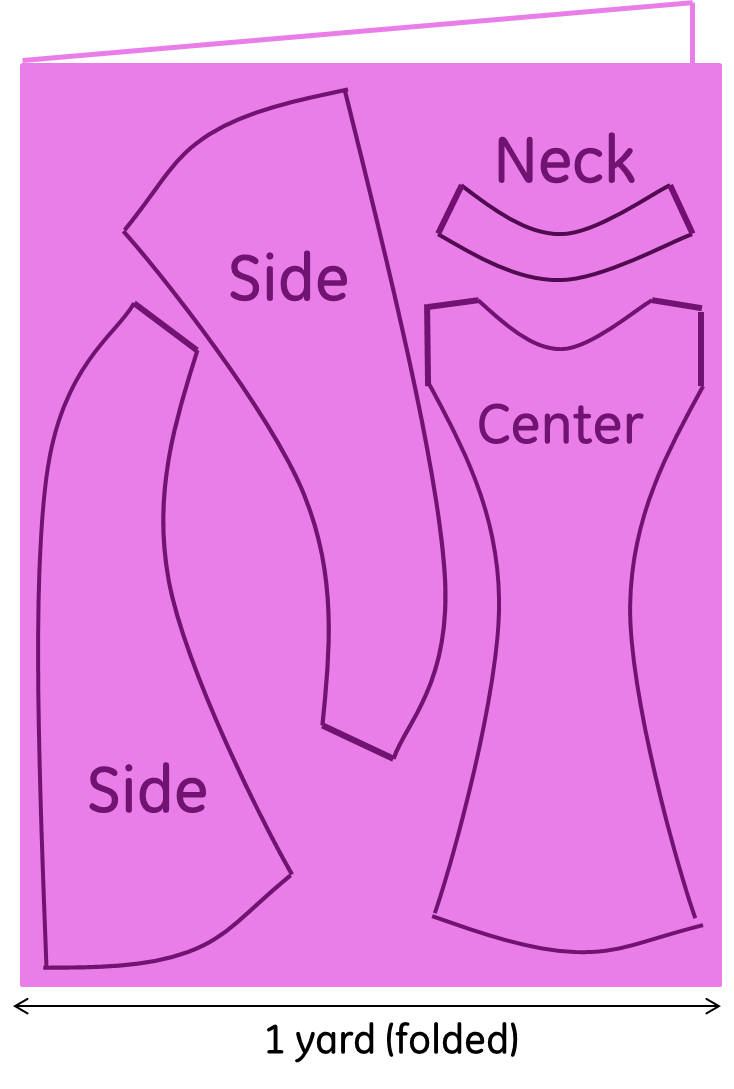 1. Use some paper, a pencil, and some tape to make the three pattern pieces shown below. Make sure you also make 2 “Side” pattern pieces. Fold your 2 yards of fabric in half and pin your “Center”, 2 “Side”, and “Neck” patterns on to it as shown. Use your scissors to cut along the pattern edges, and then unpin the patterns from the fabric.