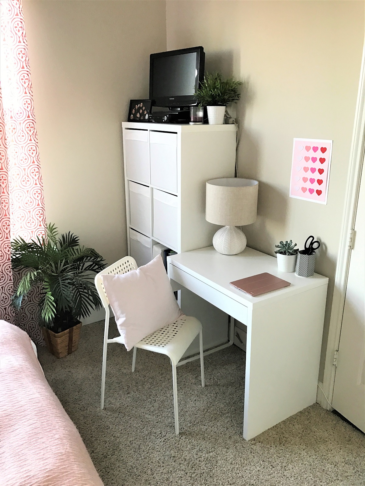 After going through these steps, I had thrown out tons of junk and moved supplies into singular spaces. As much as I loved having all of my clothing in my closet, it just wasn’t big enough to hold everything. I also found that my desk was essentially only being used as a table top for sewing and to hold my TV, and provided me with no storage for crafts and office supplies like I needed it to. In order to resolve these issues, I measured the space where my large desk was and found that I could fit a much smaller desk which was perfect for my sewing machine or computer, and a bookshelf with lots of storage and space for my TV on top.