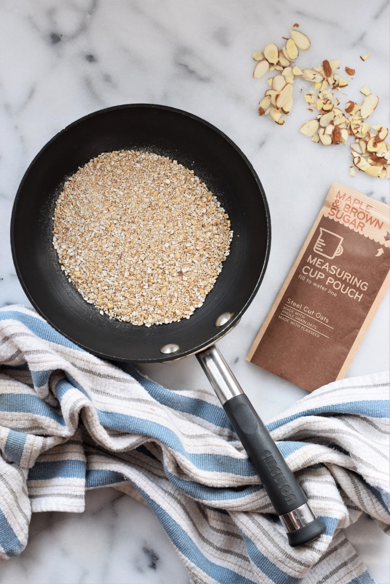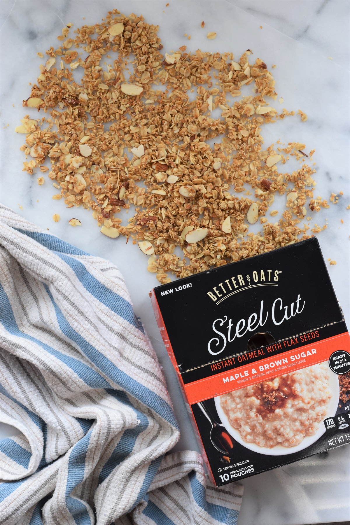 A stove top granola consists of toasting the nuts and oats, cooling them, melting butter, brown sugar, and honey, and then adding the oats and nuts back into the pan to cook. I’ve made it so many times because it’s so easy, quick, and cheap! As soon as I received this maple and brown sugar steel cut microwave oatmeal from Degustabox, I thought it would make the perfect base for my granola and make it even easier to make!