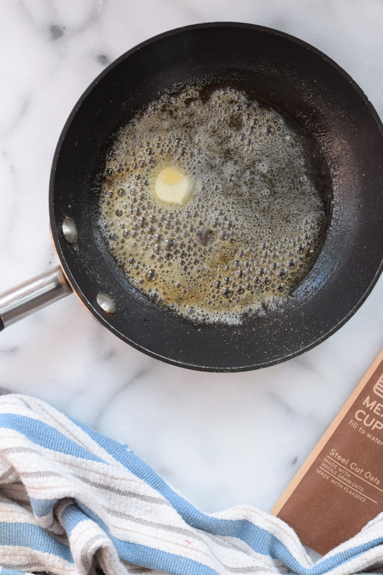2. Place your butter and a little honey or maple syrup into the pan and cook until melted. Add your oats back in to the pan and stir to combine. Pour the mixture back on to the waxed paper or tinfoil to cool for a few minutes. If you do not eat all of it at once, make sure to store it in a ziplock bag for up to a month.