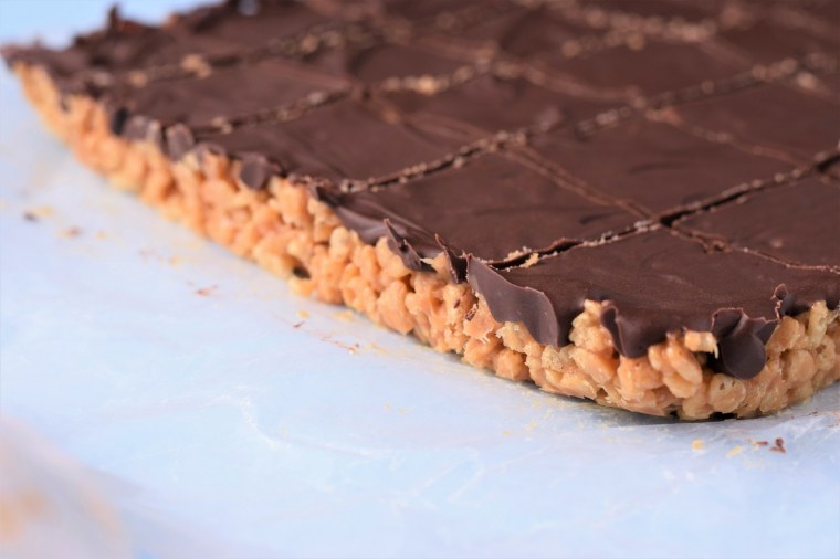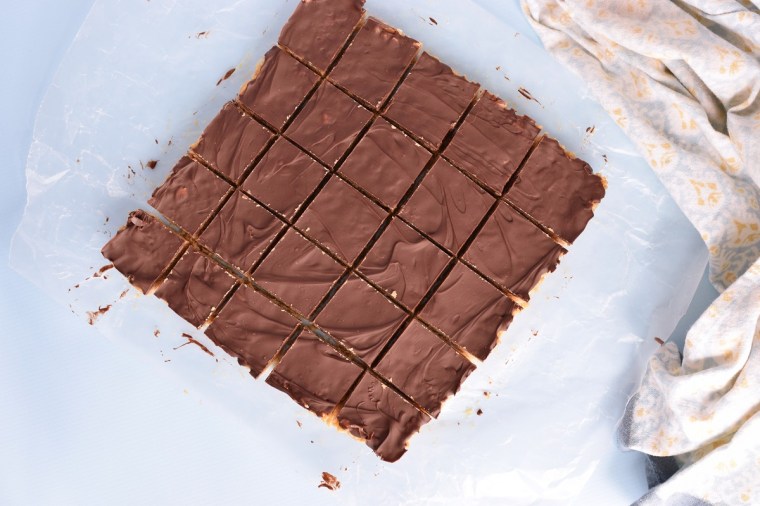 Once the chocolate has set, remove the waxed paper from the pan and cut into 25 slices. These bars can also be kept in the freezer for multiple days before serving.