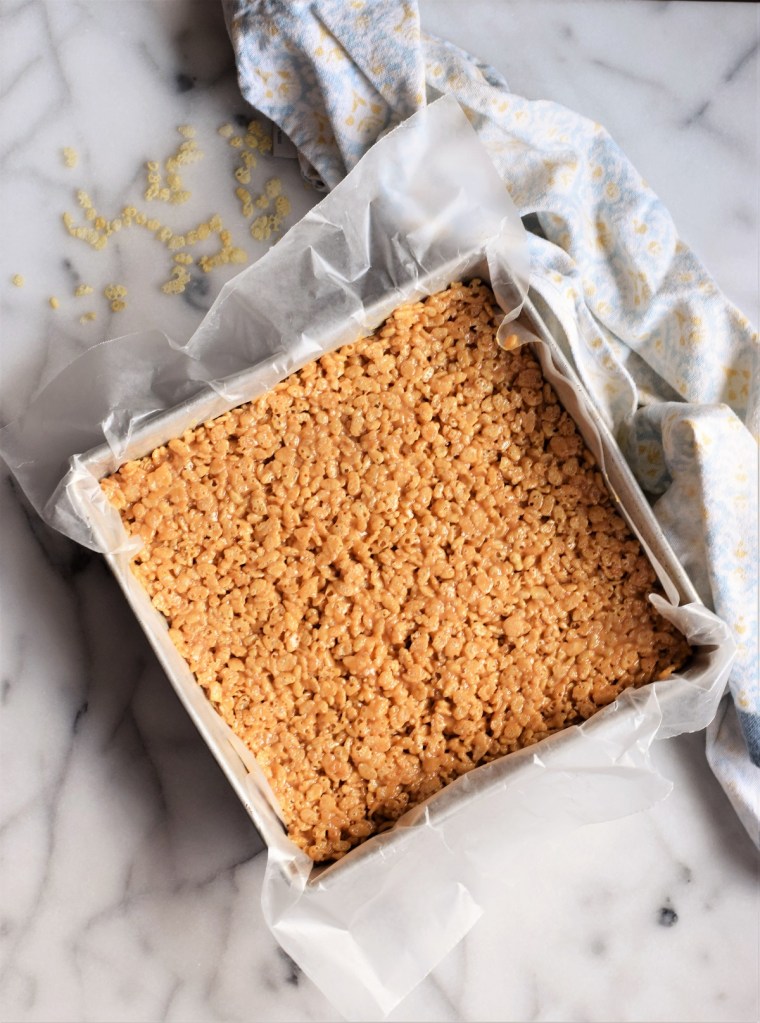 The peanut butter and corn syrup replace the fat and stickiness from the butter and marshmallows in a normal recipe, and are so much easier to press into the pan without having a horrible sticky mess on your hands. As for the chocolate, there is dairy (I am not about spending $10 on a vegan chocolate bar), but it’s minimal and I was told that it went unnoticed by the faint of stomach.