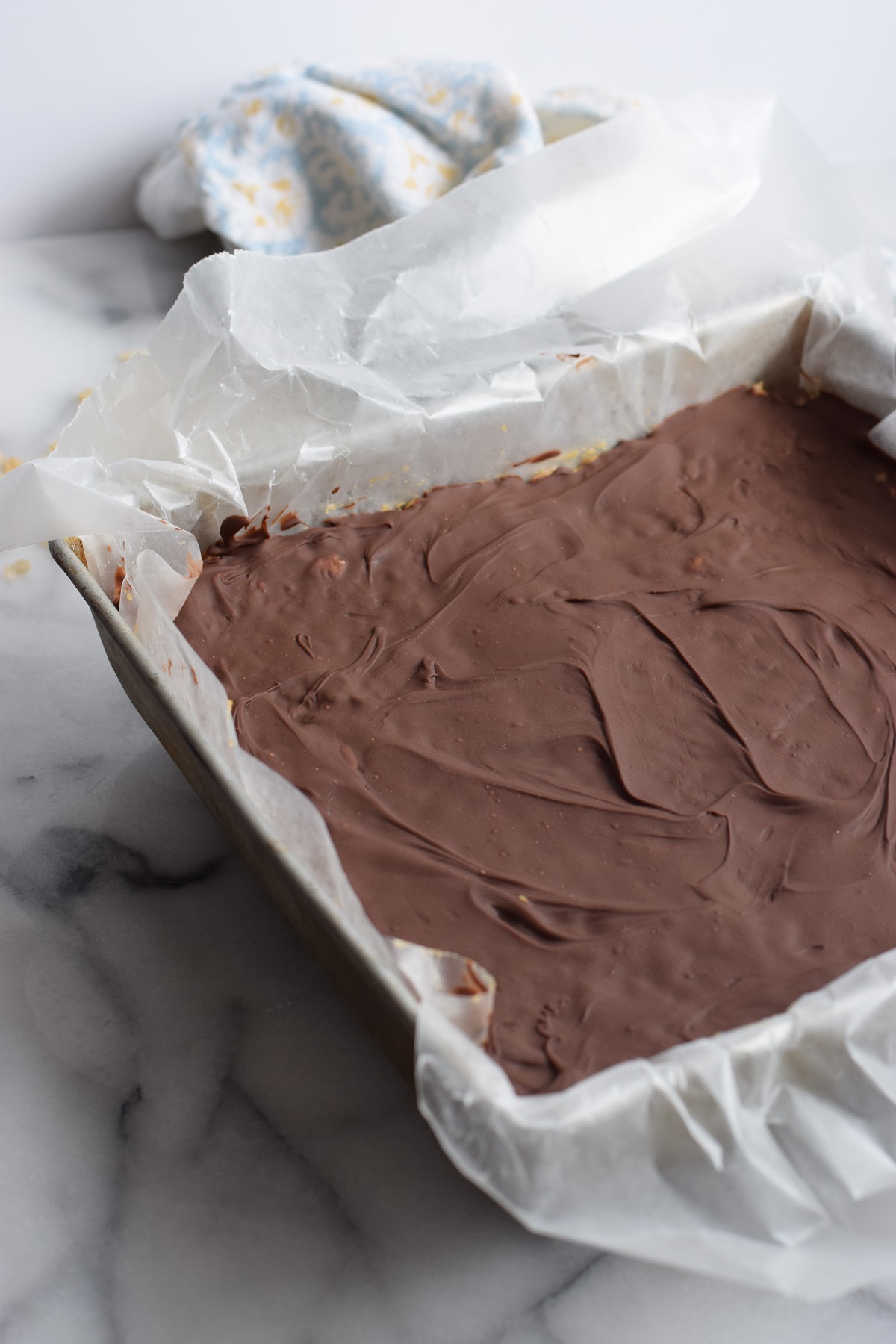 3. Once the bars have set, melt the chocolate chips with the 2 tablespoons of peanut butter in a bowl in the microwave for 30 seconds, stir, and then microwave for another 15 seconds. Stir until smooth and pour over the top of the bars. Spread it out to cover the entire pan, and then place in the freezer for another 15 minutes.