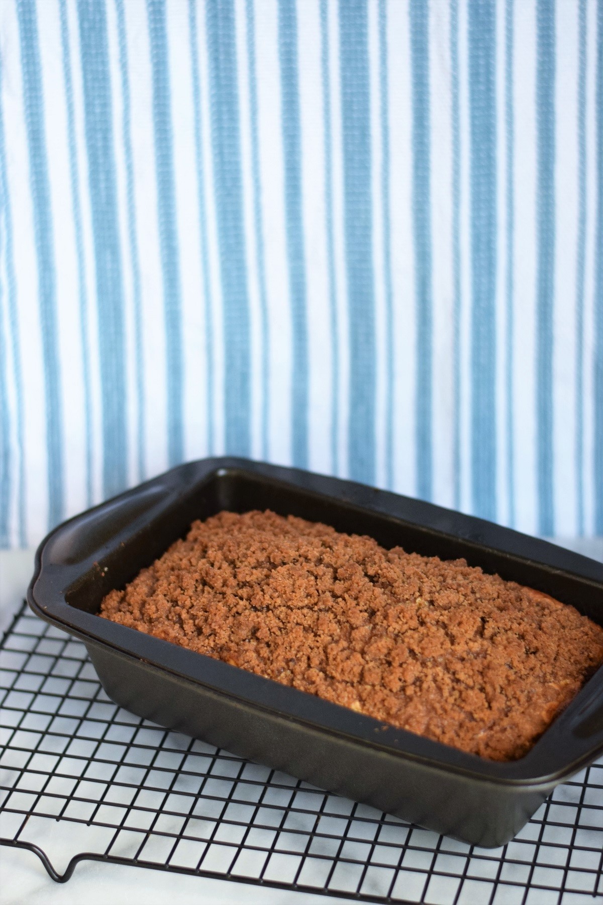 5. To assemble the loaf, pour 2/3 of the batter into the pan. Then pour in your cream cheese mixture, swirl it around, and then top with the rest of the bread batter. Top the bread with the crumble topping over the entire loaf.