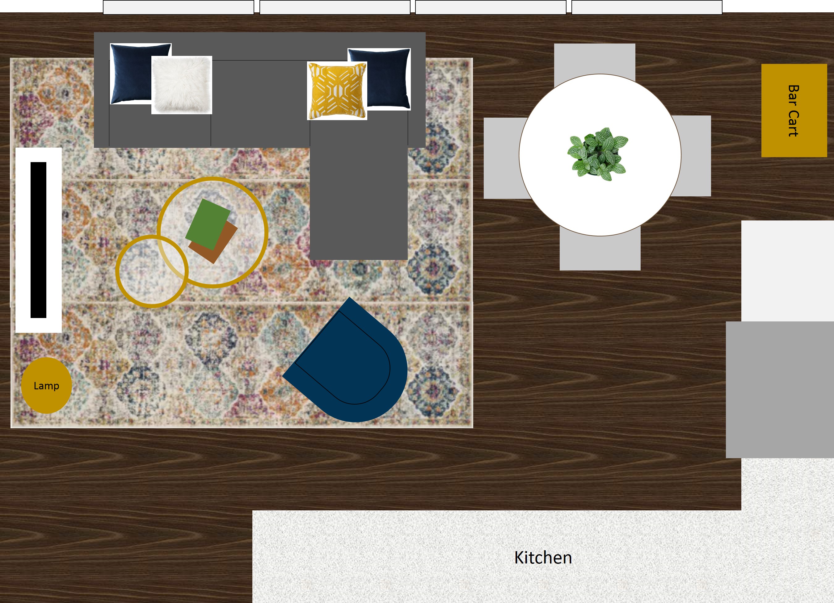 I created about 5 layouts to start, and then we talked about what she liked and didn’t like about each of them so I could tweak them. As she started to chose pieces she definitely wanted, it because easier to limit the options and we finally had a space she loved. Sometimes things like bar carts and extra pillows that were favorite pieces of hers threw off the budget, but we were able to find compromise by using a different chair, by limiting the table to fewer dining spaces, etc.