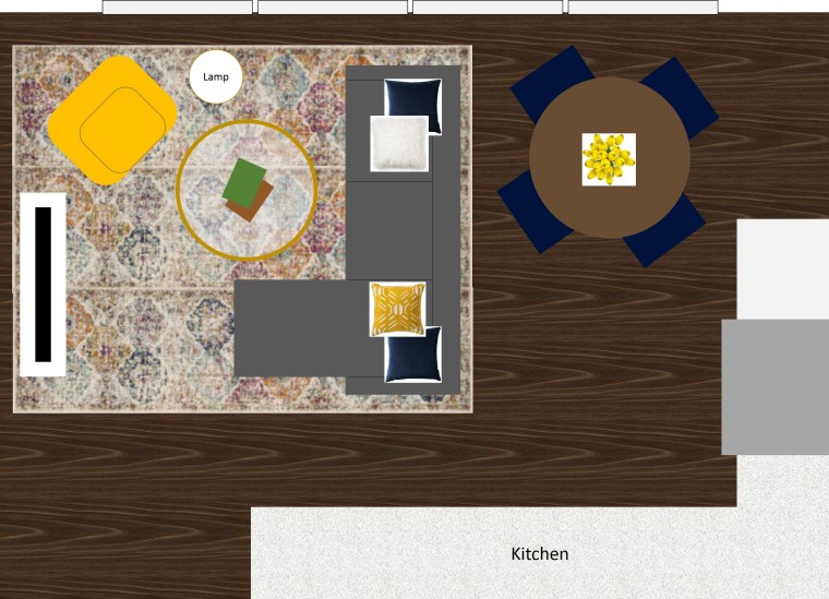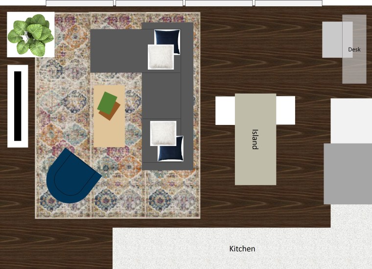 This was the final layout and design choice that Adriana went with! We both loved the calm color palette consisting of mainly gray and navy, with a few pops of gold and yellow to warm it up. By including a sectional sofa and a lounge chair in dark colors, she will have ample seating for guests to watch TV, as well as hang out with her pup without her making a furry mess.