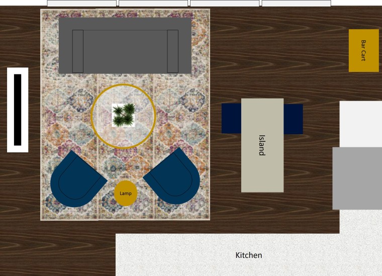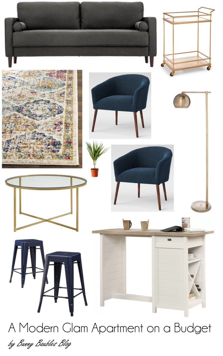Product Details: Sofa – Overstock | Gold Bar Car – Target | Bohemian Rug – Overstock | Blue Chair – Target | Gold Bulb Lamp – Target | Gold Coffee Table – Overstock | Blue Bar Stools – Target | Island – Wayfair