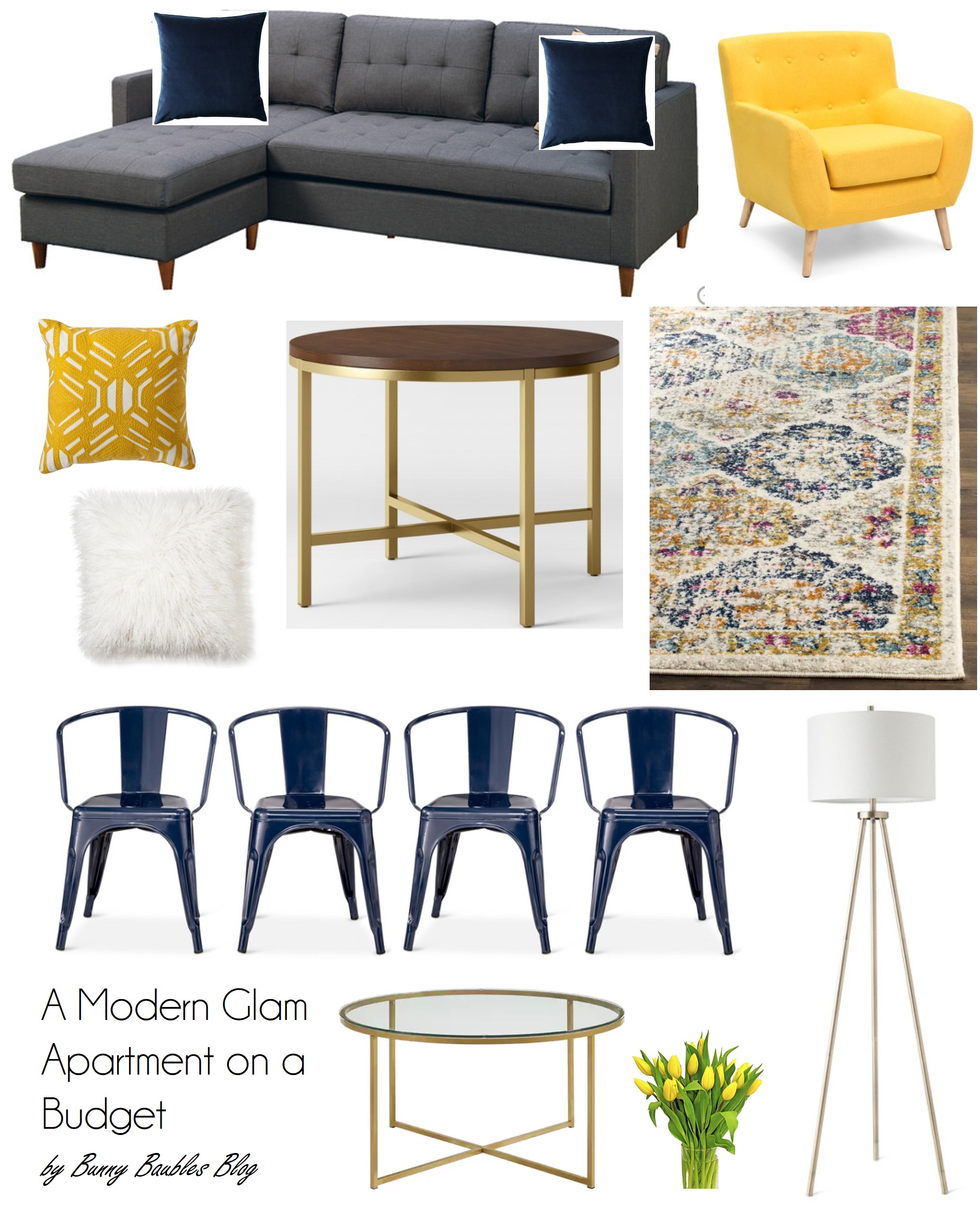 Product Details: Sectional – Houzz | Velvet Navy Pillow Cases – IKEA | Gold Bar Cart – Target | White Fur Pillow – Target | Yellow Patterned Pillow – Target | Gold Bulb Lamp – Target | Blue Chair – Target | Bohemian Rug – Overstock | Gray Dining Chairs – Target | Dining Table – Kirkland | Gold Nesting Coffee Tables – Overstock