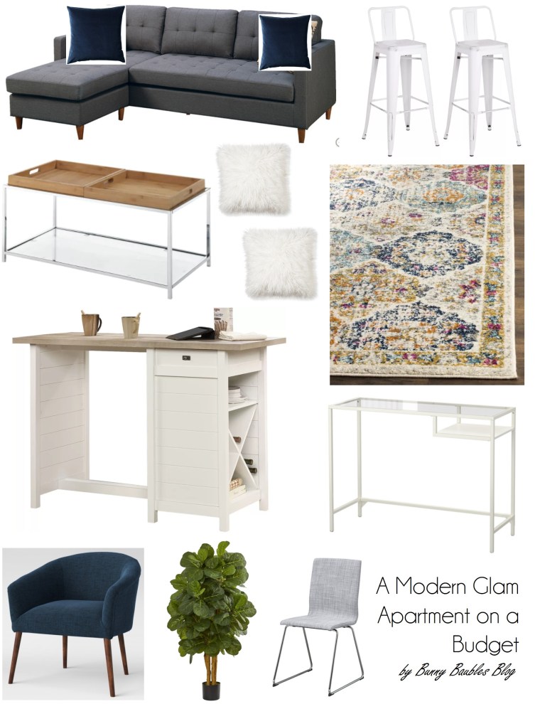Product Details: Sectional – Houzz | Velvet Navy Pillow Cases  – IKEA | White Bar Stools – Wayfair | Silver Coffee Table – Overstock | White Fur Pillows – Target | Bohemian Rug – Overstock | Island – Wayfair | Silver Desk – IKEA | Blue Chair – Target | Faux Fiddle Leaf Fig Tree – Joss and Main | Gray Desk Chair – IKEA