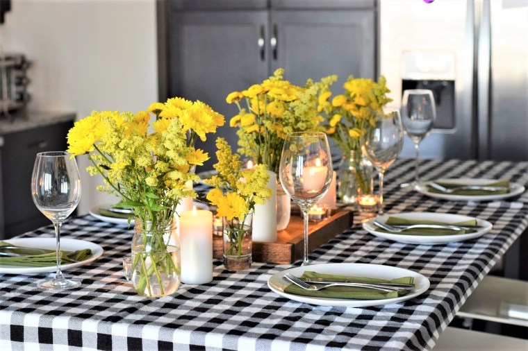 Decorating Details: Plaid Tablecloth (similar tablecloth) – made by me | Green Napkins (similar napkins) – made by me | Pillar Candles – IKEA | Tea Light Holders – IKEA
