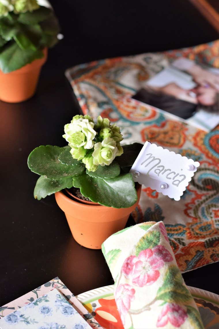 On the table we set little flower pots with peoples’ names to signify where they would sit, which also doubled as a cute favor to take home at the end of the party. A big tulle bow was tied to the back of the bride’s chair with a sprig of flowers tucked in, and we made a sign for her out of doilies. We also put strips of cute paper and pens at each seat so that people could write down date ideas and marriage advice that the couple could use over the years!