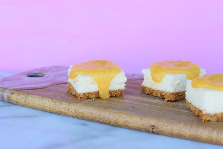 I looked through dozens of recipes and settled on a cheesecake bar that was so simple and foolproof that I could be convinced to make it on a Wednesday after a boot camp when I usually just lie on the floor and watch TV. I followed the recipe exactly except for swapping out sour cream for Greek yogurt. Dessert, but make it healthy (ish). I also made a double batch of Dessert For Two’s microwave lemon curd. Let me tell you, this is a game changer! I love her recipe and the ease of making it for topping all sorts of goodies.