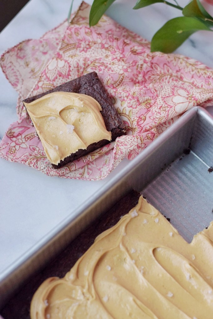 Brownies: 3/4 cup Butter 3 ounces 70% or darker Chocolate with Espresso or Coffee flavor, chopped 1 1/4 cups Sugar 1 Tbs. Vanilla 3 Eggs 3/4 tsp. Salt 1/2 tsp. Espresso Powder 1/2 cup Cocoa Powder 1/2 cup Flour Salted Peanut Butter Frosting: 6 Tbs. Butter 3/4 cup Peanut Butter 1/2 cup Powdered Sugar A few pinches of Flaked Salt 1. Preheat the oven to 325 deg F. Spray a 9″x9″ baking pan with cooking oil. 2. Melt the butter in a medium saucepan over medium-high heat. Cook the butter until it begins to smell nutty and turn brown in color, stirring continuously as the butter begins to brown. Remove the pan from heat and pour the butter into a medium bowl. 3. Add the chopped chocolate to the bowl with the butter and stir to melt. Add in the sugar and vanilla while the butter is still warm and stir vigorously to combine. 4. Add in the eggs, salt, and espresso powder and stir to combine. Add the cocoa powder and flour into the chocolate mixture and stir until just combined. 5. Pour the batter into your prepared pan and bake for 25 to 30 minutes, or until a toothpick inserted into the center of the pan comes out clean. Cool on a wire rack. 6. While the brownies are cooling, make your salted peanut butter frosting. Warm the butter to room temperature and whip it until smooth and light. Add in the peanut butter and powdered sugar, and whip until combined. 7. Frost your brownies once they have cooled and sprinkle with flaked salt.