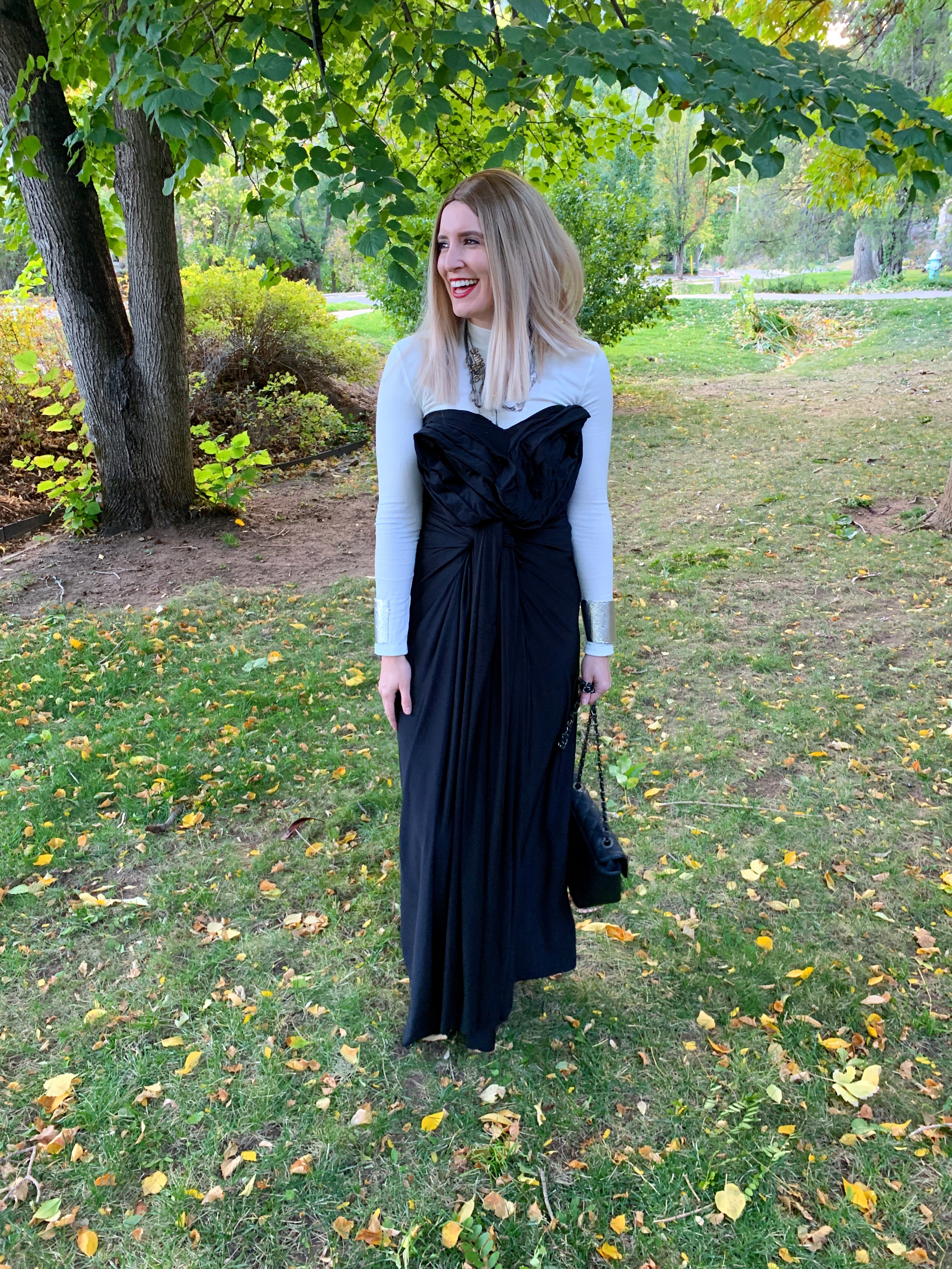Moira is the mother of the Rose family and a truly a fashion icon. She is constantly changing her look, while keeping very much on brand – black, white, a whole lot of accessories, red lipstick, and always a wig! Once I decided this was the look I was going to go for, there were truly hundreds of options. I love so many of her really complex looks, but in order to make it a quick and easy costume, I chose one of her most iconic looks from the show. She wore a white turtleneck tee, topped with a Raf Simons for Jil Sander gown. Resembling more of a trash bag than anything else, she tops the look with her classic blonde wig, silver cuffs, and layers of chain necklaces. Though it requires a bit of assembly, this look isn’t that hard to pull off for Halloween!