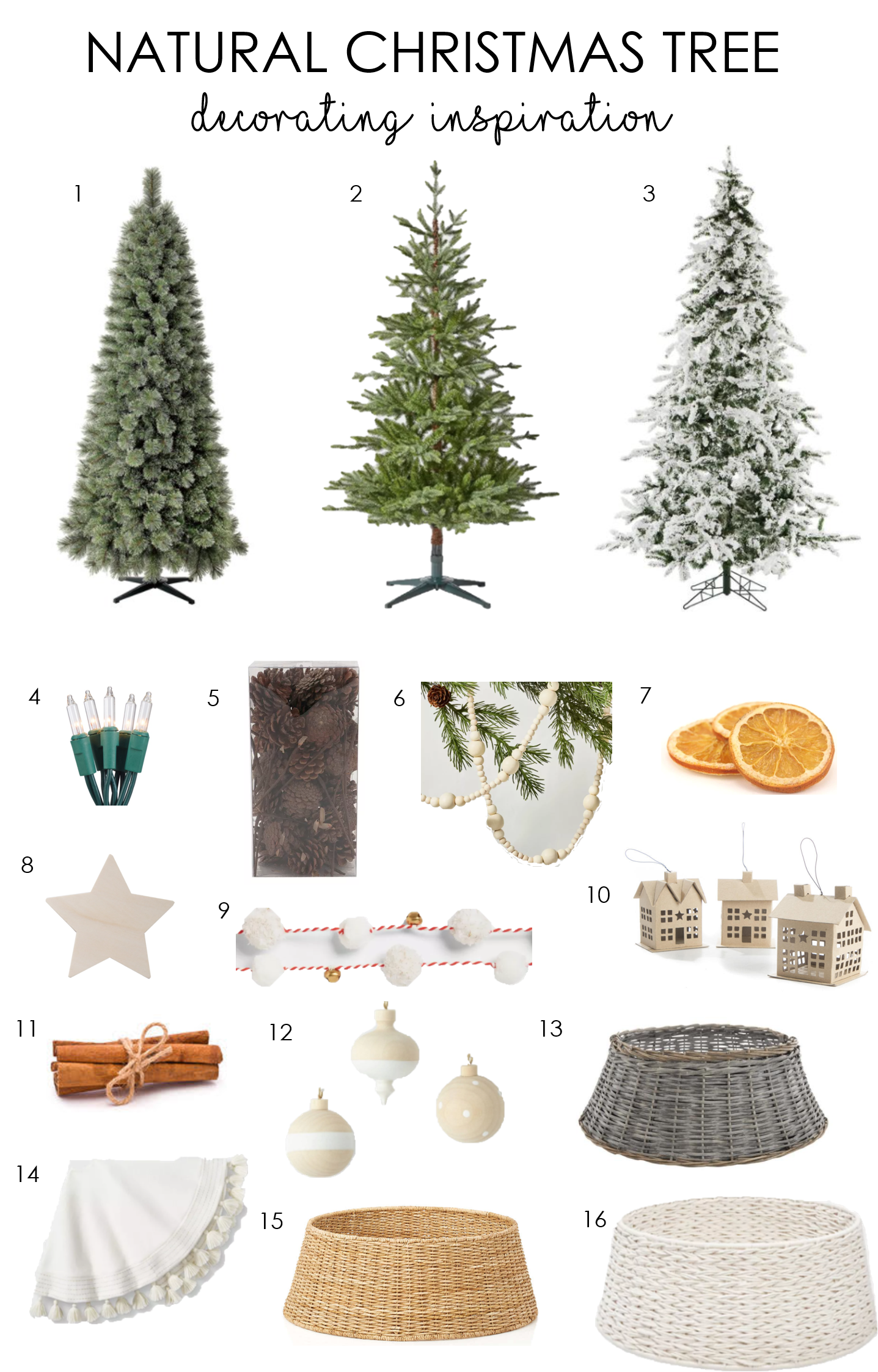 1. Spruce Cashmere Tree 2. Balsam Fir Tree 3. White Snowy Pine Tree 4. Clear Mini Lights 5. Pine Cones 6. Wood Bead Garland 7. Dried Orange Slices 8. Wooden Stars 9. Pom Pom Garland 10. Paper Mache House Ornaments 11. Cinnamon Sticks 12. Wooden Ornaments 13. Brown Basket Tree Collar 14. Tree Skirt with Tassels 15. Natural Basket Tree Collar 6. White Rope Tree Collar