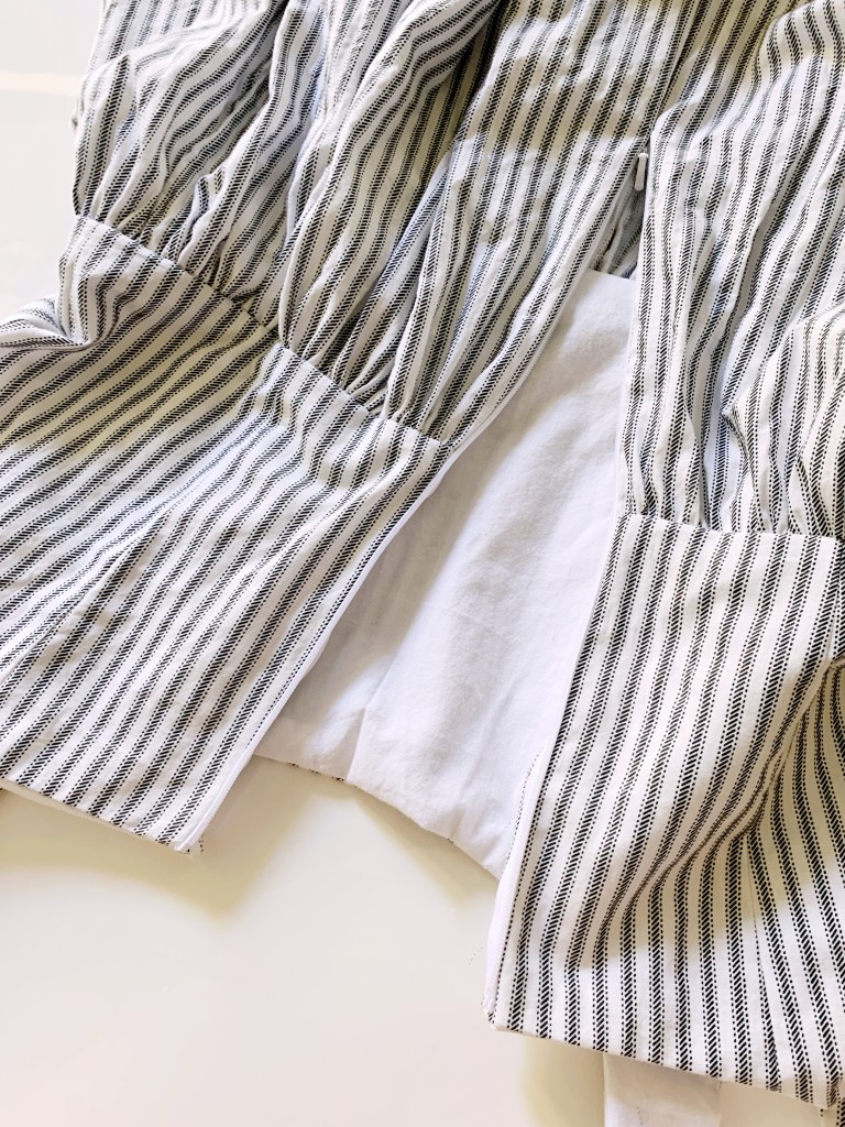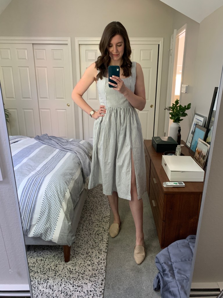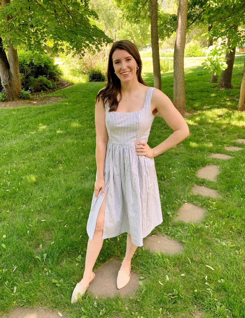 I used a cotton striped fabric perfect for hot summer days. I picture this out on the beach by the ocean, though we don’t have a trip planned for that so we just may have to now. The major customization I made on this dress was for the skirt. I cut four pieces of fabric to create a midi gathered skirt, but I made the front two different widths so I could sew in a slit at one leg.